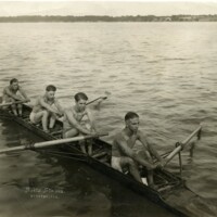 Photograph of the Decatur Boat Club. From left to right: Dorwyn Bennington, Harold Carr, Jack Hathaway, and Thomas Pope.
