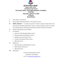 Tags: Agenda, Approval of 2024 meeting schedule, collection development policy, Decatur IL, Decatur Public Library, DEI committee, emergency succession plan, January 2024, Management personnel handbook, Minutes, monthly meeting, personnel policy and public relations, Recommendation of marketing firm, reports, Rick Meyer