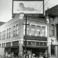 Photograph of the Parlor Market, located at 103 N. Main Street, Lincoln Square, The Food Center, Retail Groceries and Meat. Photograph of Decatur Public Library Display Window featuring Parlor Market.
