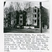 Photograph of 404-418 W. Main St. This building was built by J.R. Henton and J.W. Richardson, brother-in-law of Henton, in 1909-1912. It was known as the Henton Apartments. In 1954 it was owned by Don Richardson of Shelbyville, IL., who is a son of…