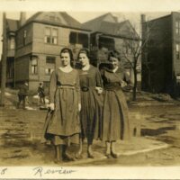Photograph of Mary, Vera, and Ruth standing outside the Review Publishing Co. in Decatur, IL in 1918.
