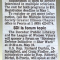 Browse Items (1 total) Tags: Screening clinic Browse All Browse by Tag Search Items Sort by: Title Creator Date Added League of Women Voters - News Article - Multiple Sclerosis - Screening Clinic - 1989 This is a historical account of correspondence of the League of Women Voters of Macon County Tags: 1989, Decatur IL, Decatur Memorial Hospital, Grace Methodist, Herald and Review, League of Women Voters, Multiple Sclerosis, News Article, Screening clinic