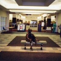Various photographs taken during the grand opening of the Decatur Public Library of the child statue donated by the Maddens in the lobby near the entrance to the library.