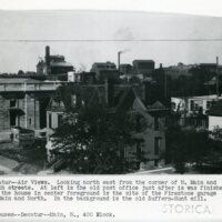 Photograph "Decatur -- Air Views. Looking north east from the corner of N. Main and North streets. At left is the old post office just after it was finished and the house in center foreground is the site of the Firestone garage at Main and North…