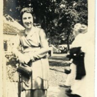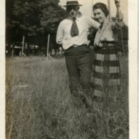 Photograph of E. Coole and Vivian Stroh standing by a woodbine in a field in 1919