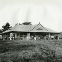 These are the photographs of the pavilion at Fairview Park. One photo includes woman and girls standing around the flower bed in front of the pavilion. The photos were taken around 1900.