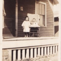 This is a photograph of 2 children on a porch of a house. There are no names, no date, nor location.
