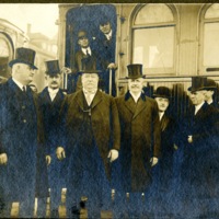 Photograph of President Howard Taft with Charles Adkins (4th from left) and several unknown men in front of a train car in Decatur, IL. This photo was found with the Adkins family photographs. Charles Adkins was Speaker of the House of Illinois.
