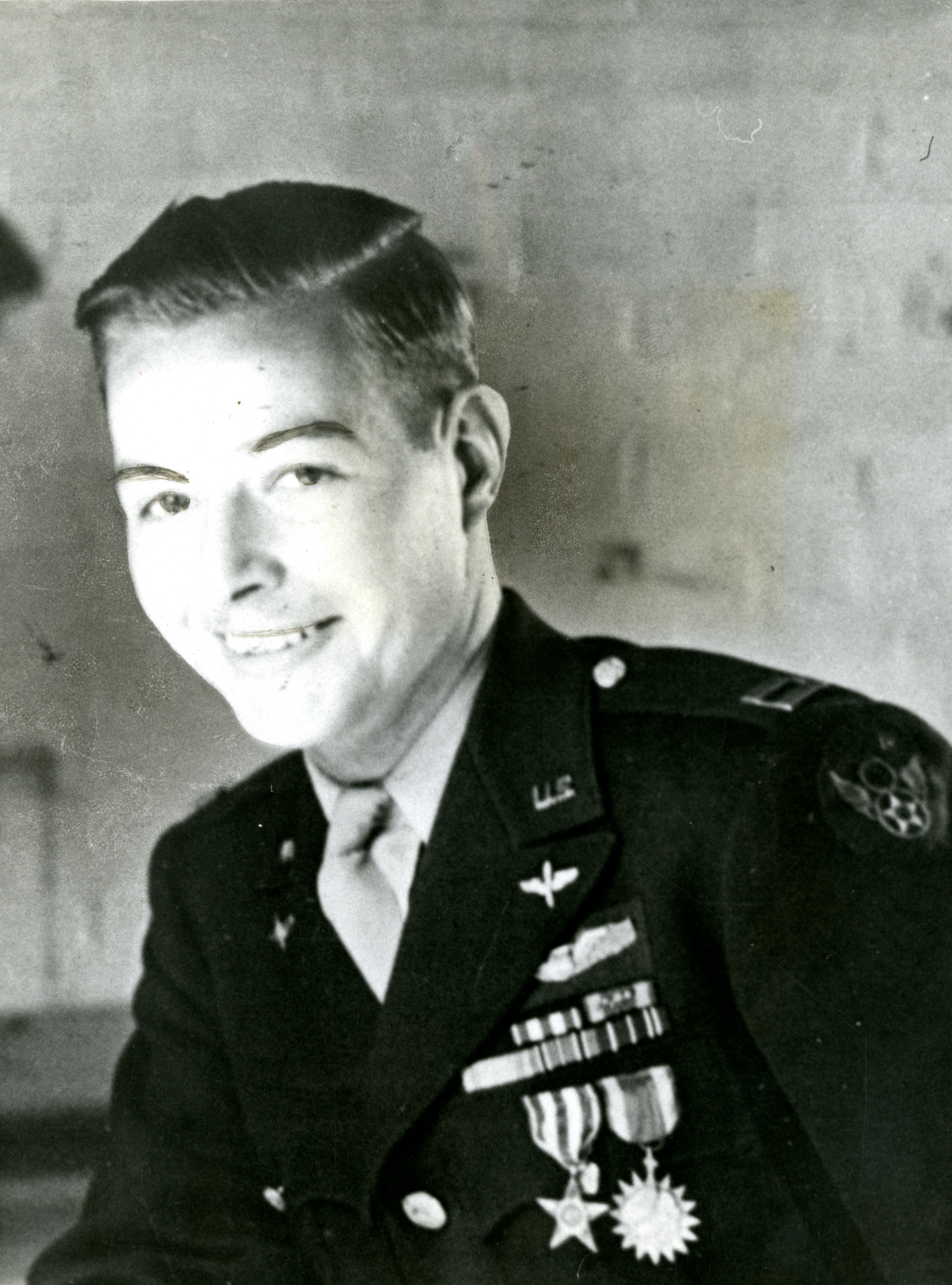 Herald and Review Library: Shaffer, Major Dale L.; Article on back of photo; "Dale L. Shaffer, 23-year old Eighth Army pilot who has made 23 bombing raids over Europe, was recently promoted to the rank of major and is now base operations officer at an American air base in England. Major Shaffer, son of Mr. and Mrs. L. G. Shaffer, 509 Stuart avenue, holds the Air Medal, three Oak Leaf clusters and the Silver Star. The citation for which he received the Silver star reads: 'For gallantry in action, while serving as combat leader on a bombing mission over enemy occupied continental Europe, July 14. Under his inspiring leadership, a highly important and heavily defended military objective was successfully bombed.' The oficer is a former Decatur high school football star and student at James Millikin university."