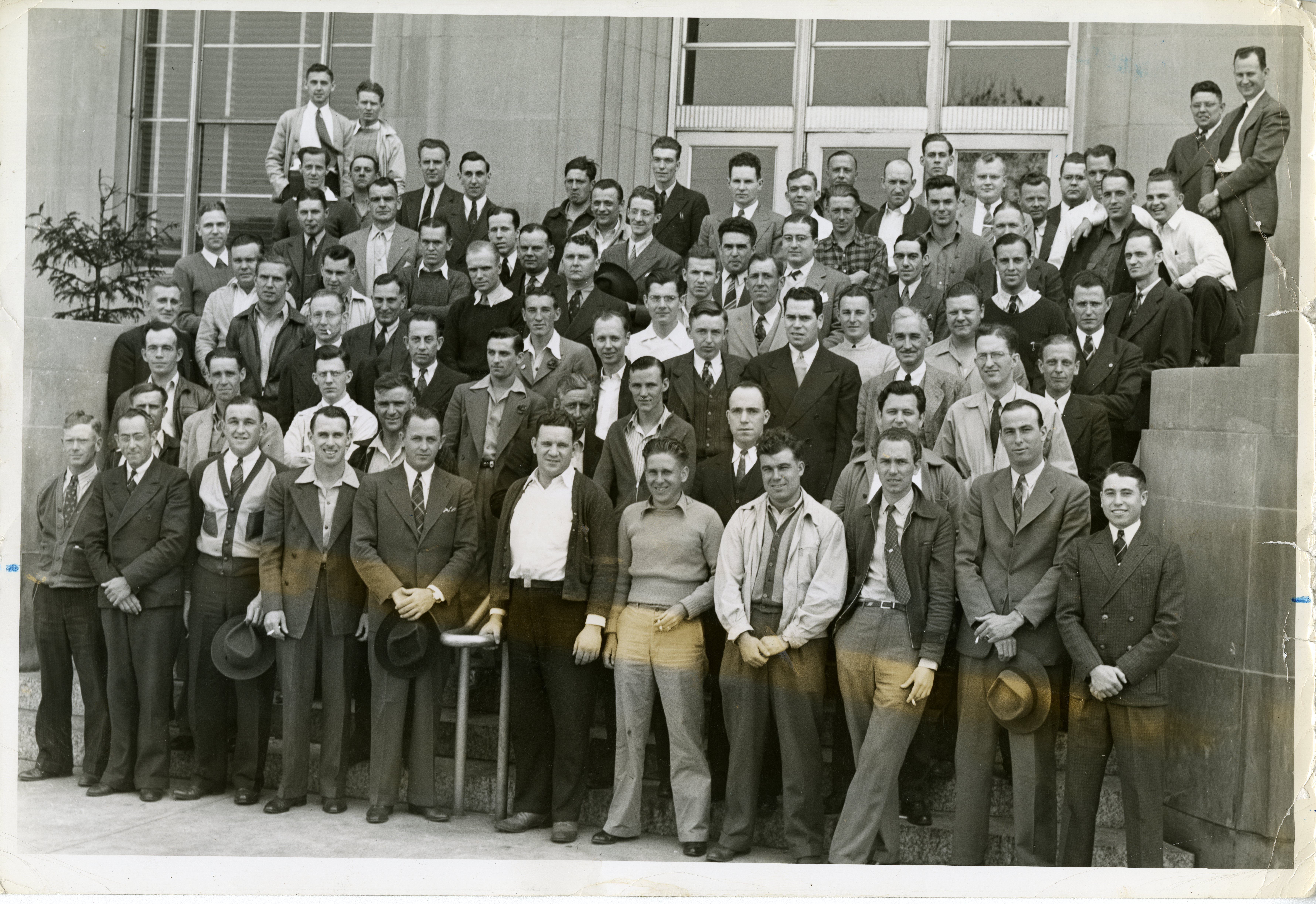 Herald and Review Photo: Compulsory Military Training Macon County Draftees standing on Court House Steps; Article on back of photo; "This group of selectees were scheduled to leave the city for Peoria medical examination center and induction into the U. S. Draft army this morning. Eighty-six men were to leave in two cars of an ITS train from the local station at 3:30 a.m. Many of this group might return within the next few days, either because they were rejected after examination or because they were granted a furlough after induction."