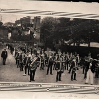 Photograph of the Goodman Band marching down a street in Decatur, IL as part of a parade; AS58. Photo BS53: H. Mueller Leading Goodman Band MBA Picnic Parade, 1901. Photo BS59: Dick Mueller; died 4/19/1943. He was the drum major for eleven years of the old Goodman 4th Infantry Band in Decatur. He was a drum major for almost 50 years and had belonged to several well-known bands and had traveled all over the U.S. in this occupation. While living in Decatur he was in the cleaning and dyeing business. Photo ran 5/27/1928.