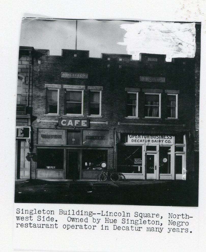 Photographs of Hue Singleton's Restaurant located on the Northwest side of the Lincoln Square. "Negro restaurant operator in Decatur many years."