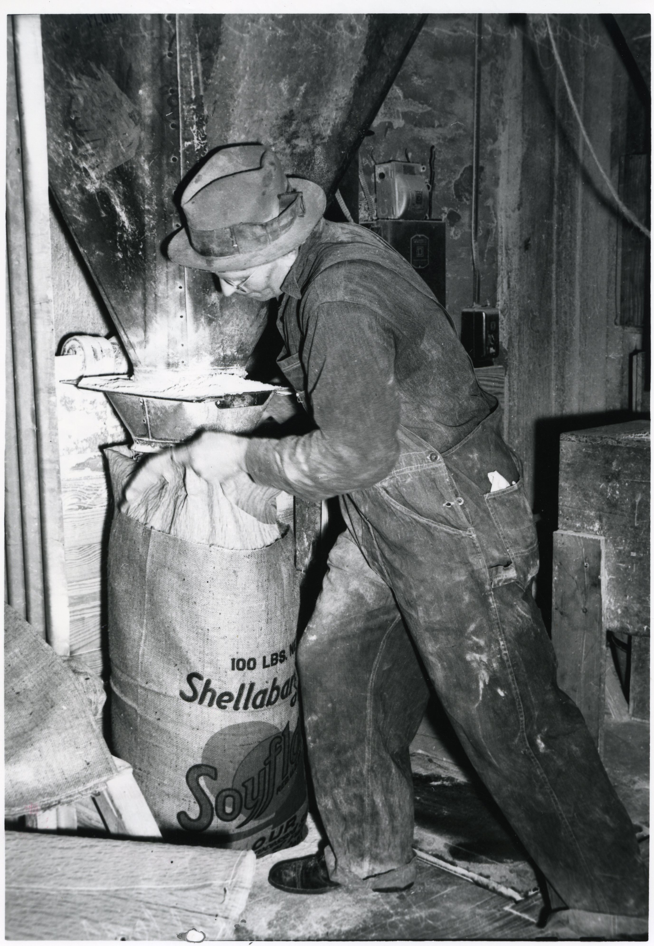 Photograph BS231: Grain Storage Building with cars and trucks parked nearby. Photo BS232: Worker bagging flour. Photo BS233: Workers bagging soy flour. Photo BS234: Shellabarger Buildings.
