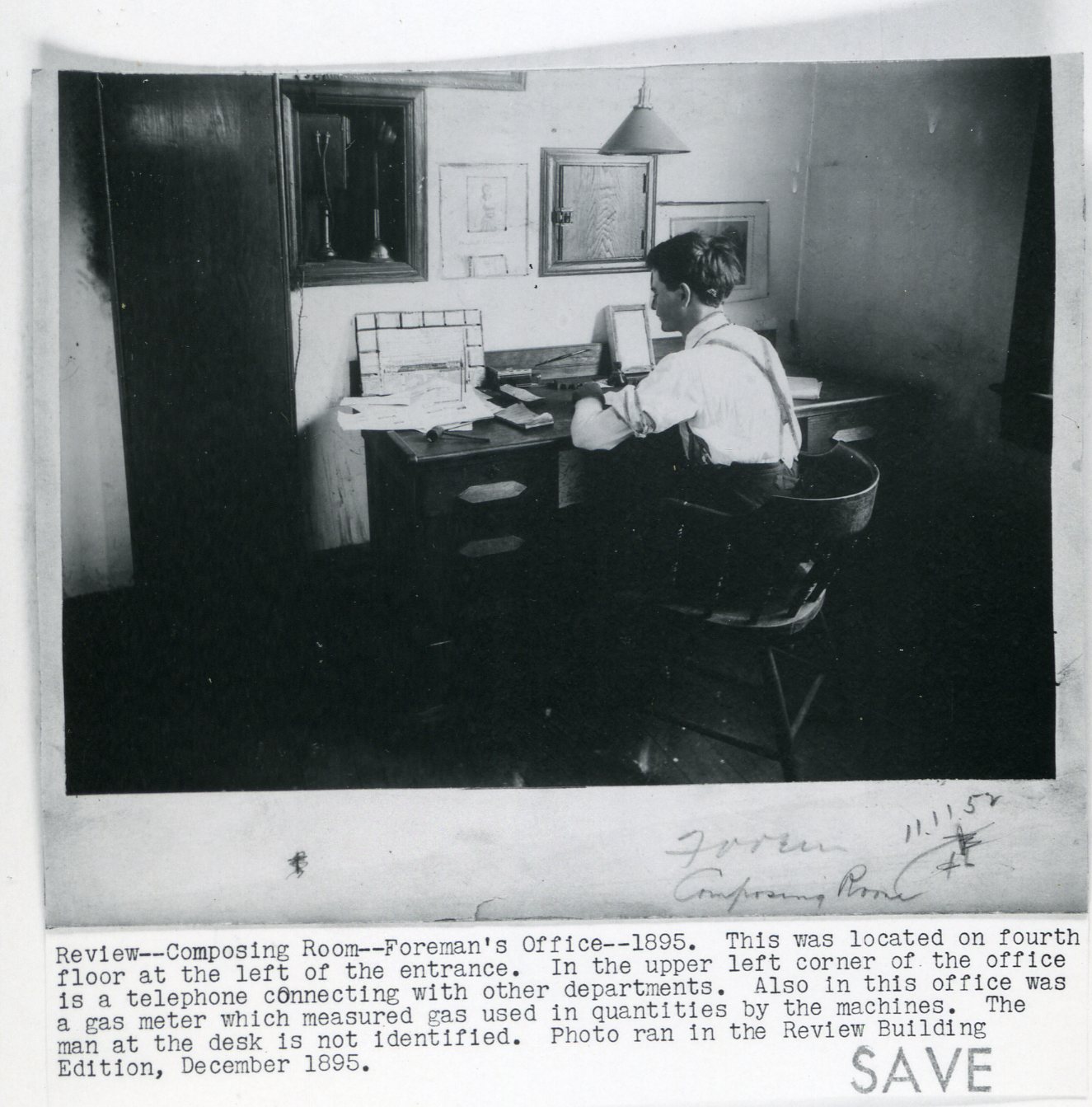 Photo BS318: Review Composing Room-1895. Photo ran in the Review Building Edition December 1895. The composing room was on the fourth floor. Photo BS319: Composing Room Foreman's Office. This was located on the fourth floor at the left of the entrance. In the upper left corner of the office is a telephone connecting with other departments. Also in this office was a gas meter which measured gas used in quantities by machines. The man at the desk is not identified. Photo ran in the Review Building Edition, December 1895. Photo BS320: Review Building 365 N. Main St. Photo BS321: Review Building Annex. Photo BS322: Review Building--1888. Located 100 Block W. Prairie Street, back of the Suffern Building. Photo ran in the Review Quarter Century Edition, December 7, 1913. Photo BS323: Review Building Annex. Photo made as the tank for the sprinkler system was hoisted to the roof of the building in 1912.