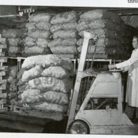 Photographs of ladies bagging chips, moving bags of potatoes, loading truck with potatoes chips, packing boxes with chips, conveyer belt with potato chips, child sampling chips and men checking packaged product.