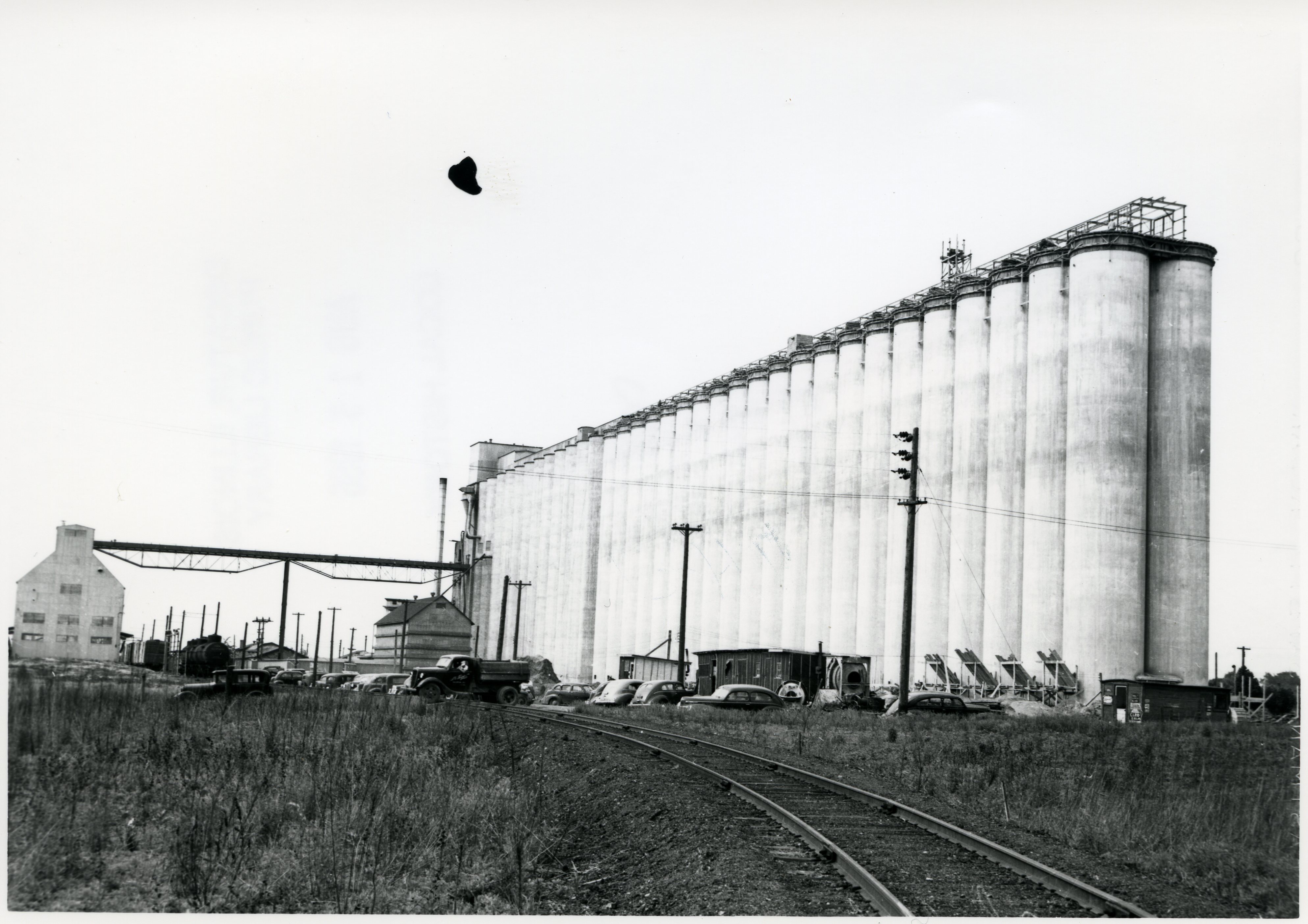 Photograph of the Shellabarger Grain Storage Silos. Photograph of worker bagging flour. Photograph of two men bagging flour. Photograph of the Shellabarger Buildings.