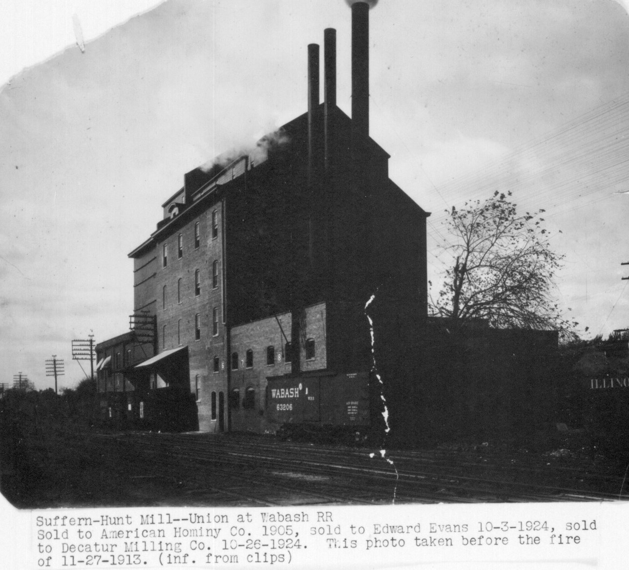 Photograph of the Suffern-Hunt Mill--Union St. at Wabash Railroad. sold to American Hominy co. in 1905, sold to Edward Evans 10/3/1924, sold to Decatur Milling Co. 10/26/1924. Wabash R.R. Crossing Shanty in the foreground. Photograph of the new Suffern-Hunt Mill, taken 1914. BS2327 "Suffern-Hunt Mill--Union at Wabash RR Sold to American Hominy Co. 1905, sold to Edward Evans 10/3/1924, sold to Decatur Milling Co. 10/26/1924. This photo was taken before the fire of 11/27/1913."