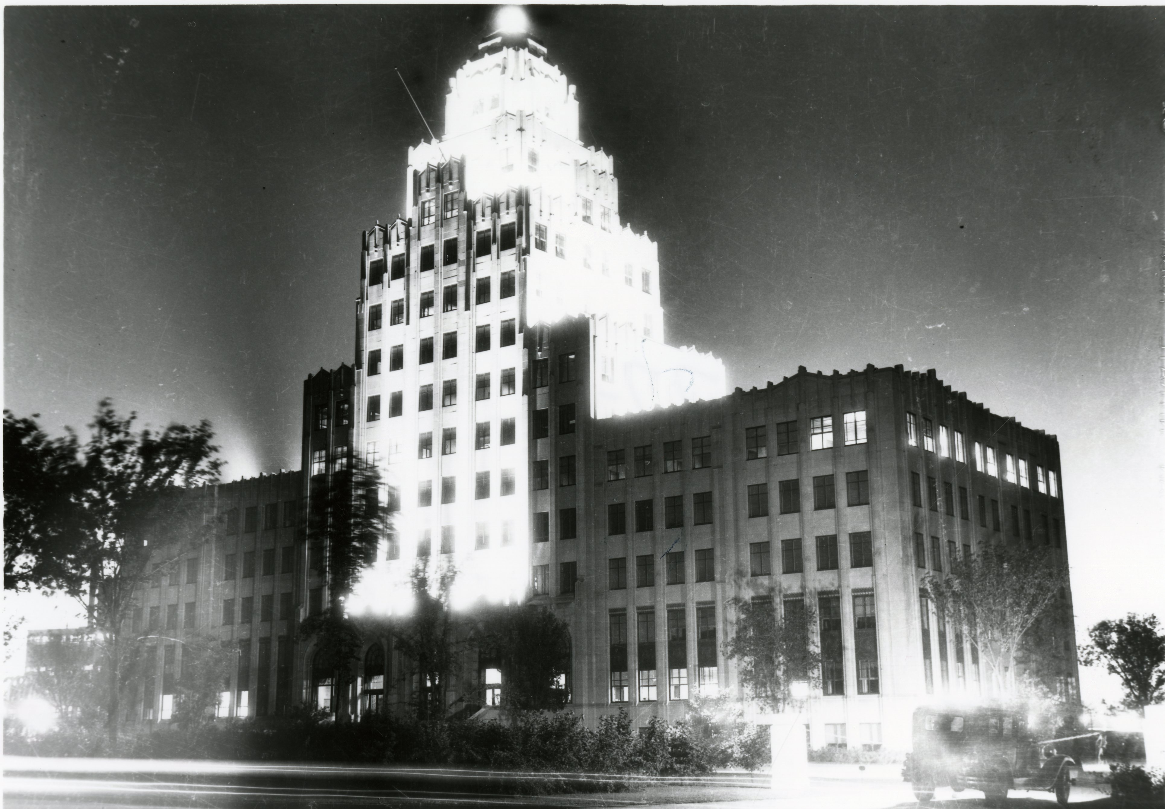 Post card of the Staley Office Building at night. Photograph of the Dust Collector. Photograph of man watching conveyor belt. Photograph of A. E. Staley baseball field. Photograph of the Staley Office building with flood lights. Photographs of plants facilities. Photograph--aerial view of A. E. Staley Mfg. Co. Photograph BS247 shows the Staley buildings, the view is of the east and insustrial section in 1912.
