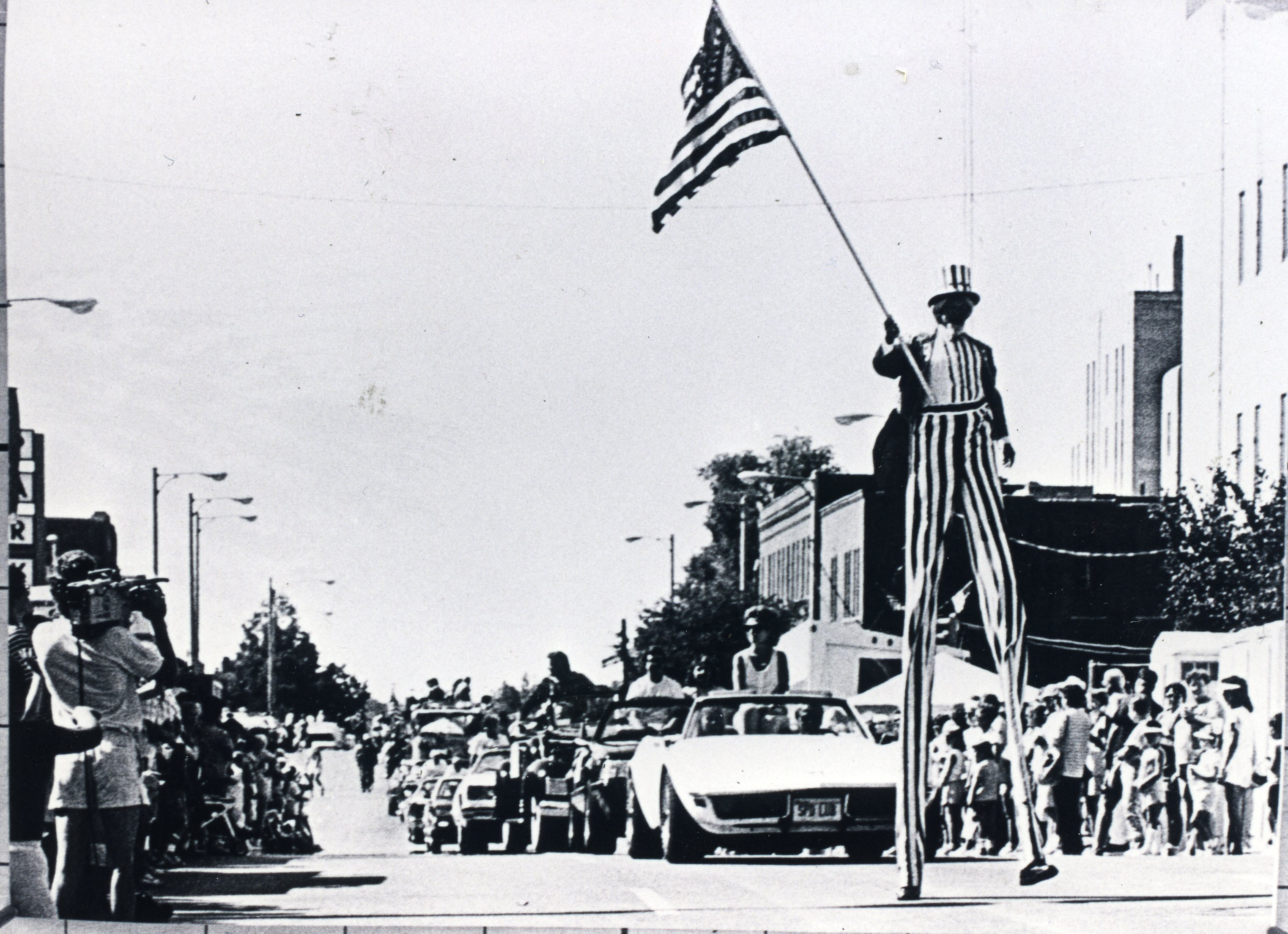 Various photographs from the 1986 Decatur Celebration showing people participating in the celebration. Celebration Parade, Uncle Sam on stilts. Photograph of celebration crowd.