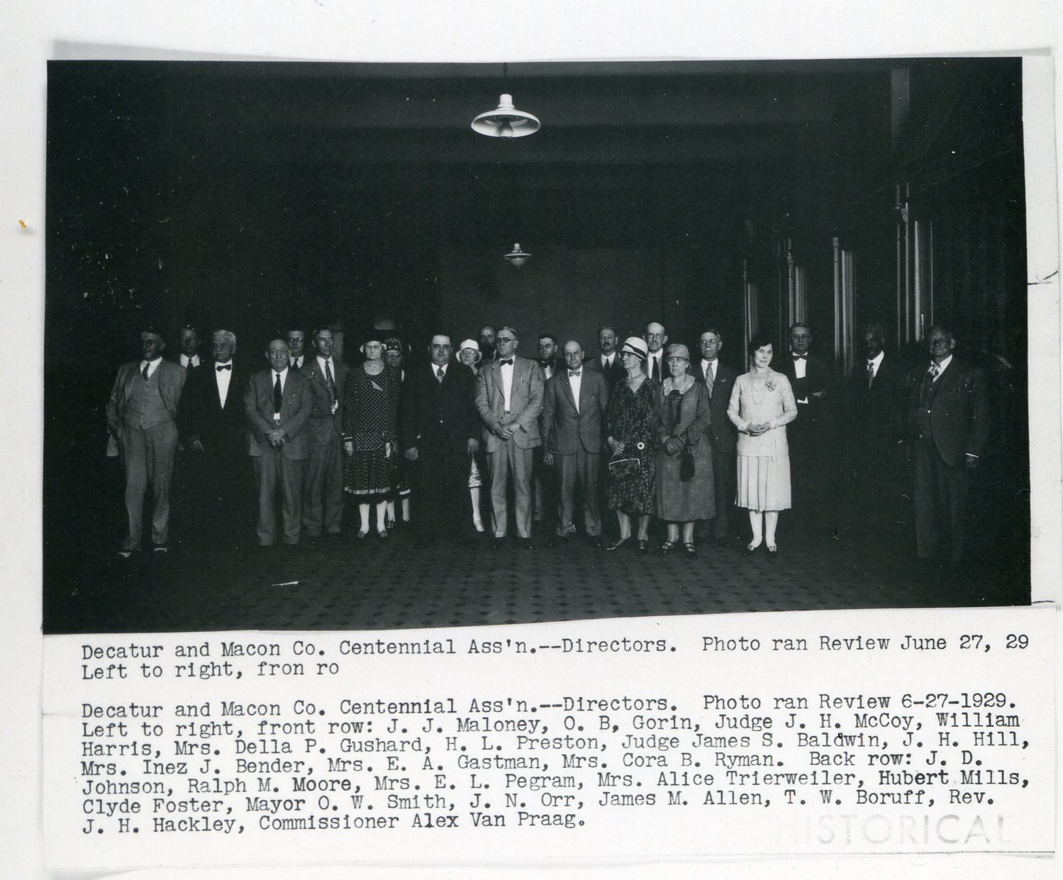 Photograph of the Logo for the 100th Anniversary of the Decatur/Macon County Centennial Association Celebration. Photograph of the Directors of the Decatur/Macon County Centennial Association. Pictured left to right, front row: J. J. Maloney, O. B. Gorin, Judge J. H. McCoy, William Harris, Mrs. Della P. Gushard, H. L. Preston, Judge James S. Baldwin, J. H. Hill, Mrs. Inez J. Bender, Mrs. E. A. Gastman, Mrs. Cora B. Ryman. Back row: J. D. Johnson, Ralph M. Moore, Mrs. E. L. Pegram, Mrs. Alice Trierweiler, Hubert Mills, Clyde Foster, Mayor O. W. Smith, J. N. Orr, James M. Allen, T. W. Boruff, Rev. J. H. Hackley, Commissioner Alex Van Praag. Photo ran Review 6/27/1929.