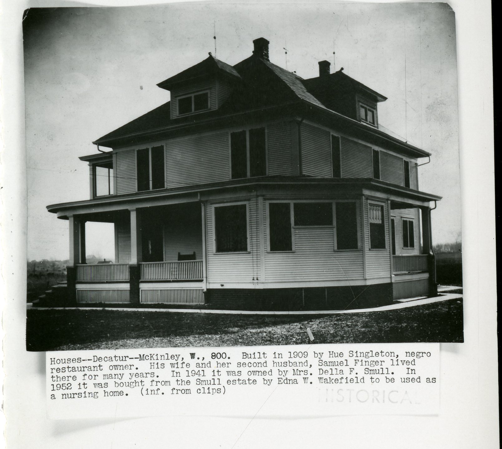 Photograph of 800 W. McKinley. This house was built in 1909 by Hue Singleton, restaurant owner. His wife and her second husband, Samuel Finger lived there for many years. In 1941 it was owned by Mrs. Della F. Smull. In 1952 it was bought from the Smull estate by Edna W. Wakefield to be used as a nursing home.
