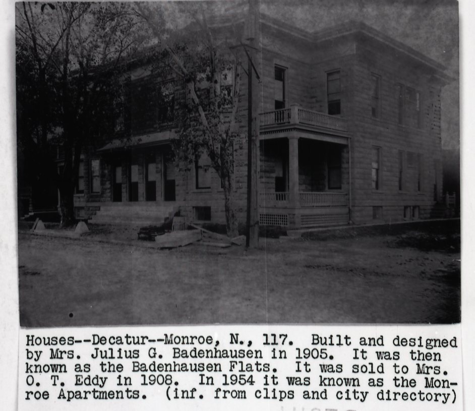 Photograph of House on 117 N. Monroe Street, Decatur, IL. Built and designed by Mrs. Julius G. Badenhausen in 1905. It was then known as the Badenhausen Flats. It was sold to Mrs. O. t. Eddy in 1908. In 1954 it was known as the Monroe Apartments. (Information from clips and city directory).