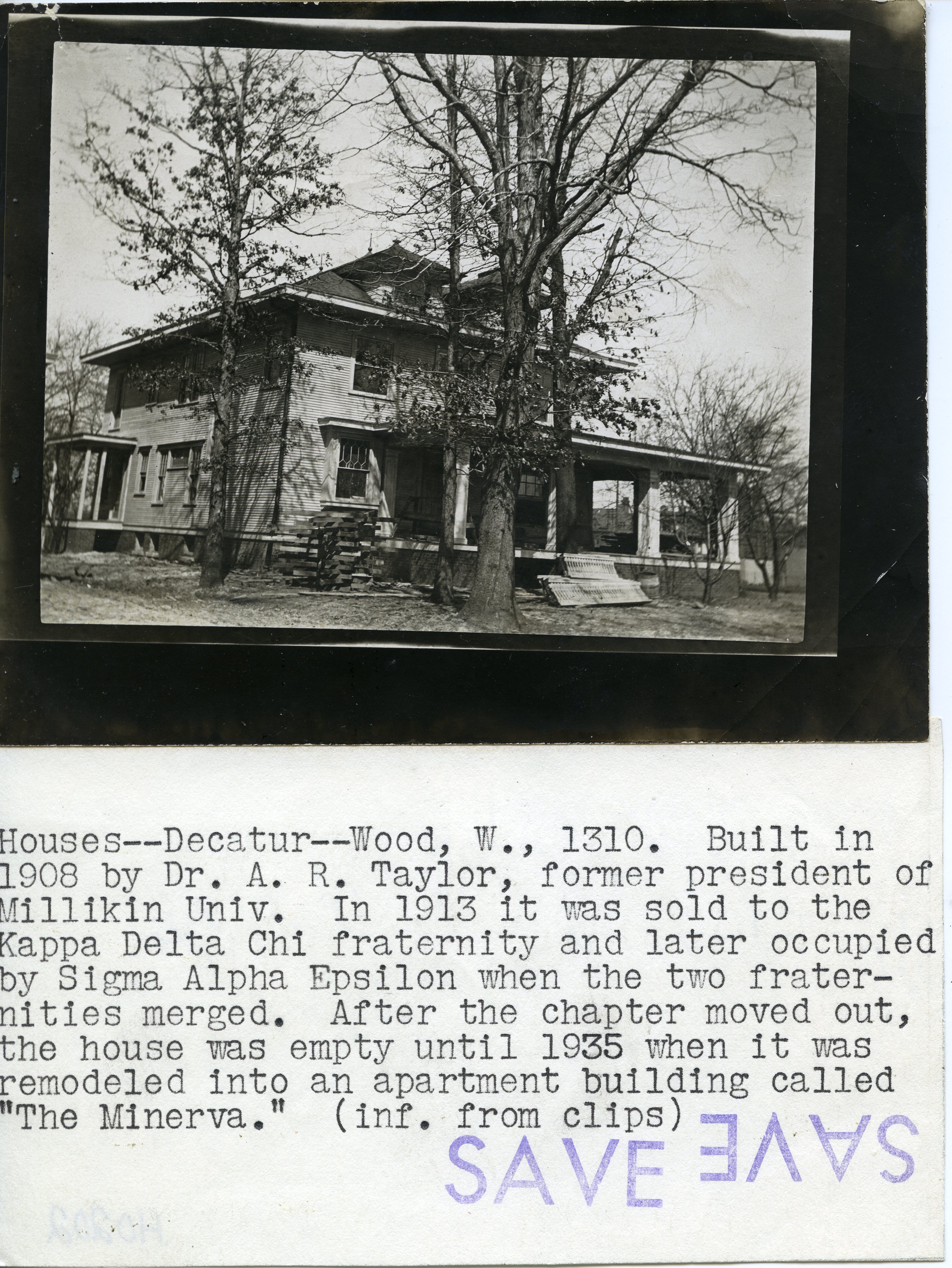Photograph of 1310 W. Wood St. This house was built in 1908 by Dr. A.R. Taylor, former president of Millikin University. In 1913 it was sold to the Kappa Delta Chi fraternity and later occupied by Sigma Alpha Epsilon when the two fraternities merged. After the chapter moved out, the house was empty until 1935 when it was remodeled into an apartment building called "The Minerva".