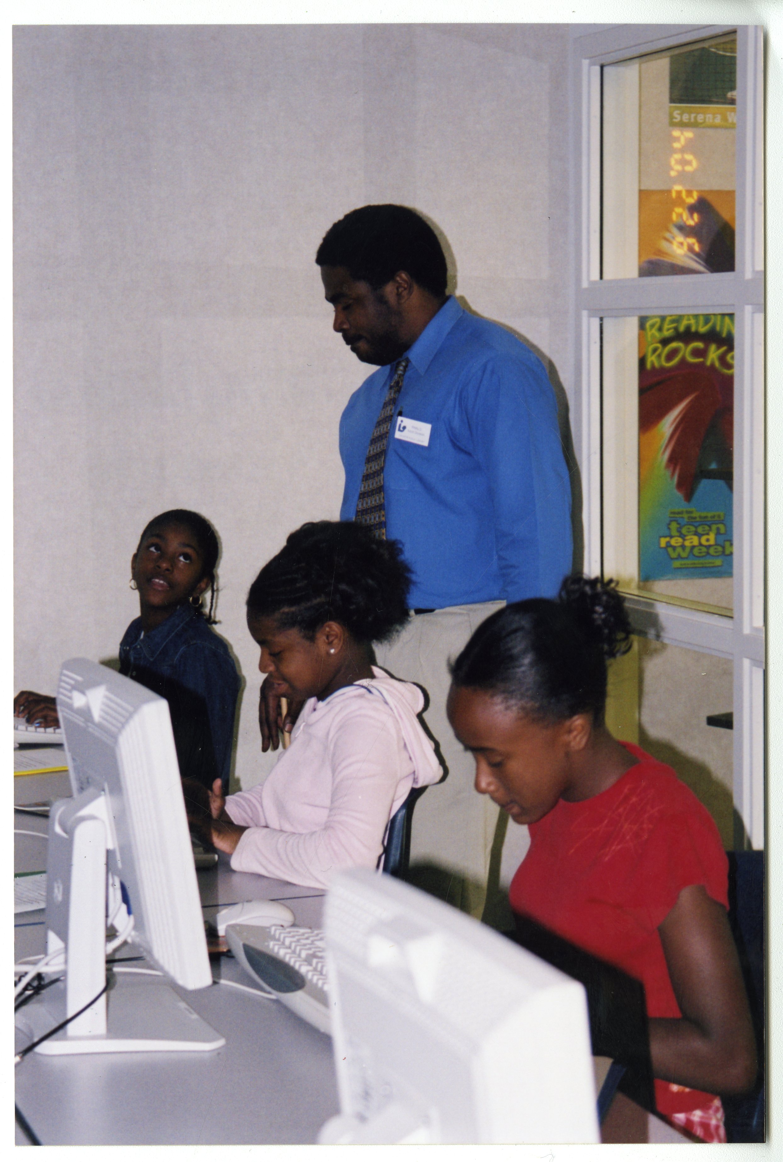 Photographs of Project Next Generation: Rhalo Thomas center helping children on computers. Photograph L-R: Giasymyne Clark, Angie Cason and Tahja Works. Photograph Rhalo Thomas, Library Ass't, with Giasymyne Clark, and Tahja Works. Photograph Angie Carson (center) assistant mentor helping Giasymyne Clark (left) and Tahja Works (right) create an MS Word document about themselves for PNG. Photograph PNG class in Staff Lounge.