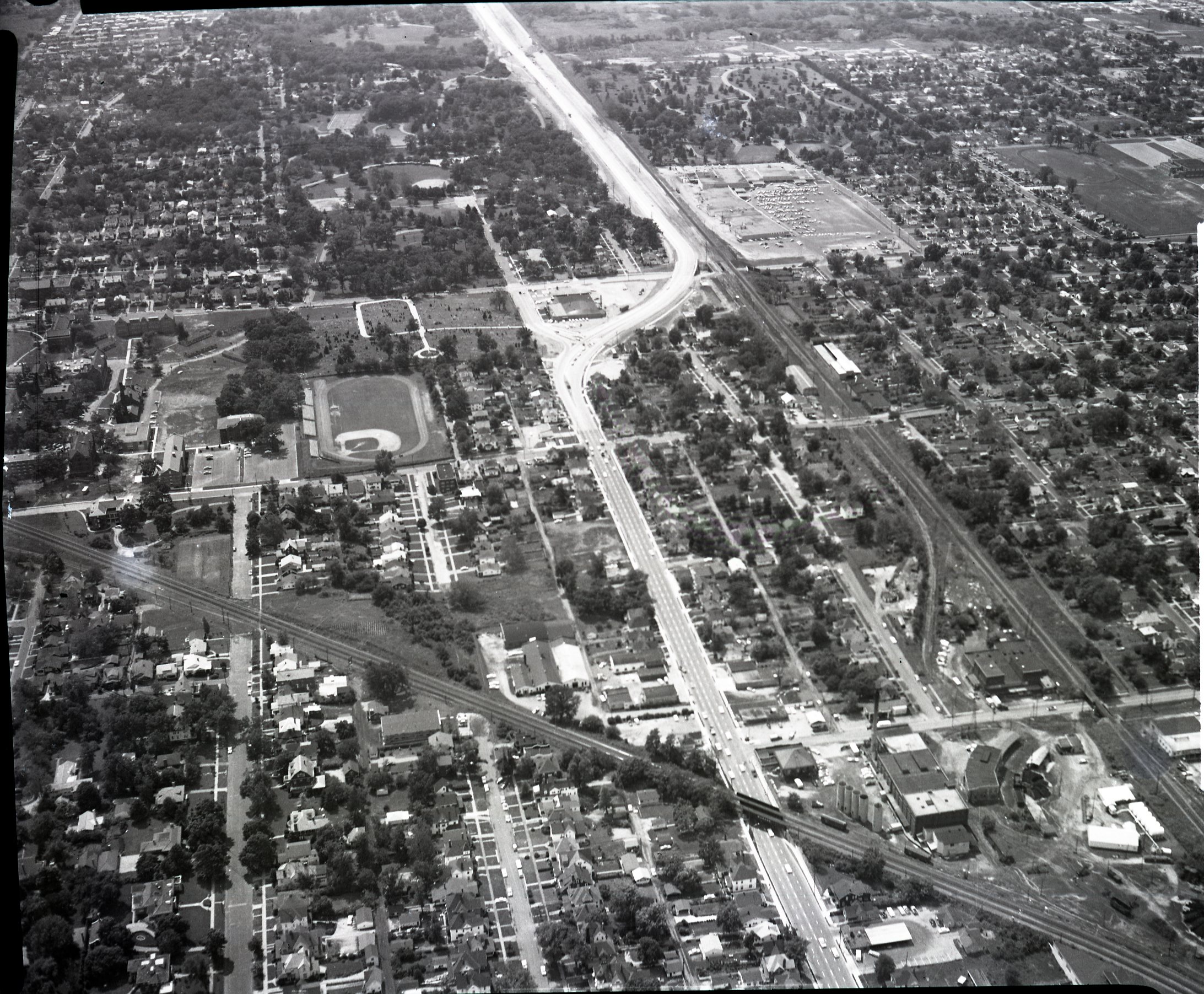 Photograph of the 800 Block of West Eldorado, looking west from the Wabash R. R. subway. the first building on the right was formerly the office building of the Decatur Cereal co. and in 1955 was the office building for the Polar Ice Co. the first intersection is N. Van Dyke, date unknown. Photograph of cars at West Eldorado and Monroe Street. Photograph of cars at West Eldorado and Fairview Avenue. Photograph: Aerial views of West Eldorado Street taken in the 1960's.