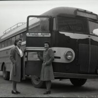 Photographs of two city buses. Photograph of bus waiting for a train. Photograph of two women by the Wilson Bus Line. Photograph of buses in the city garage. Photograph of bus and driver at Power and Light Co., 1935. Photograph of two bus drivers.