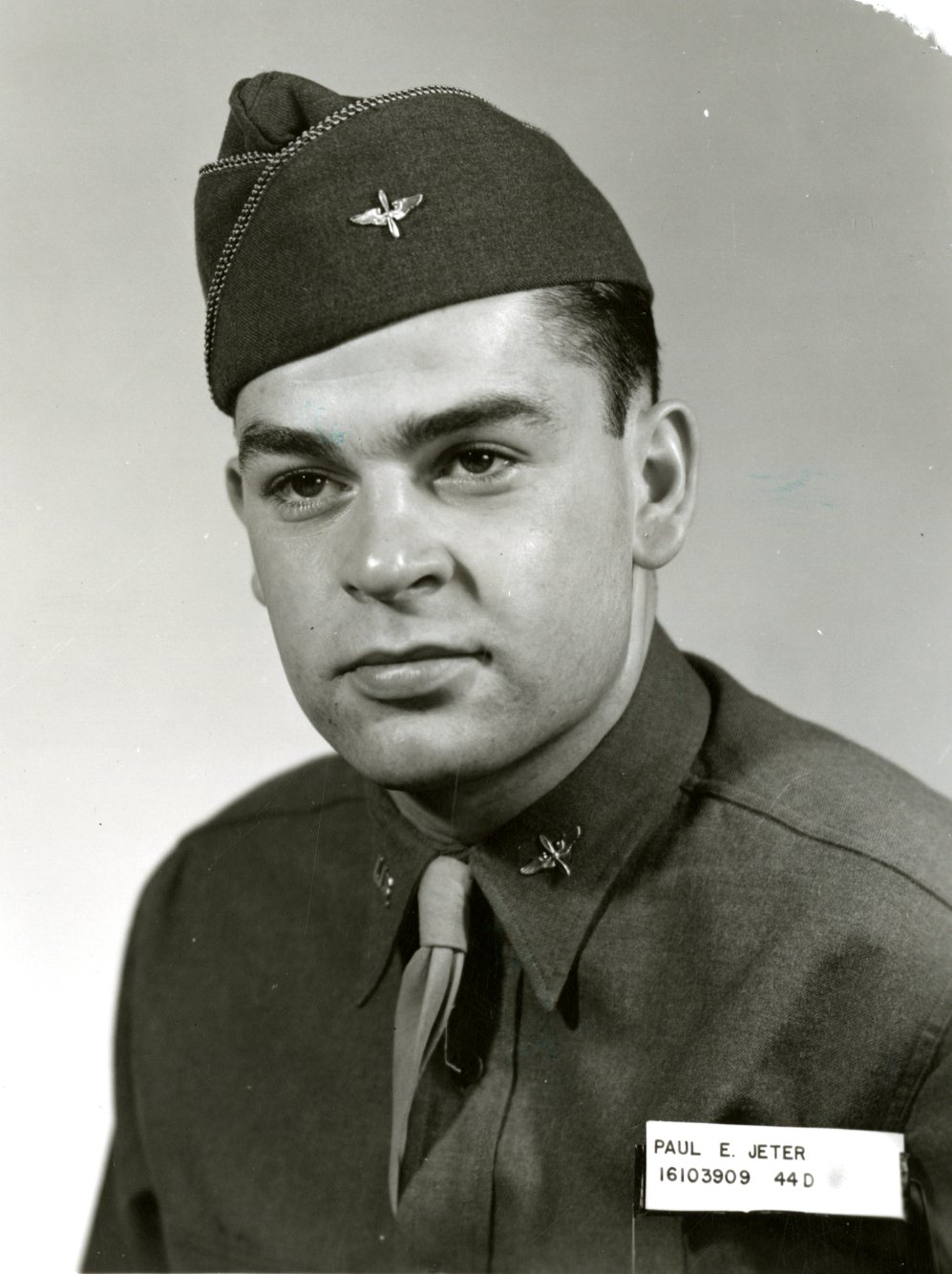 Herald and Review Library: Jeter, Paul E., Article on back of photo; "Paul E. Jeter, son of Mr. and Mrs. M. L. Jeter, 1121 West Decatur street, also graduated from bomber pilot school at Pampa Field. His wife is the former Veatta M. Grace, 523 East Center street. Before entering service in March 1943, he was a student at Millikin university."