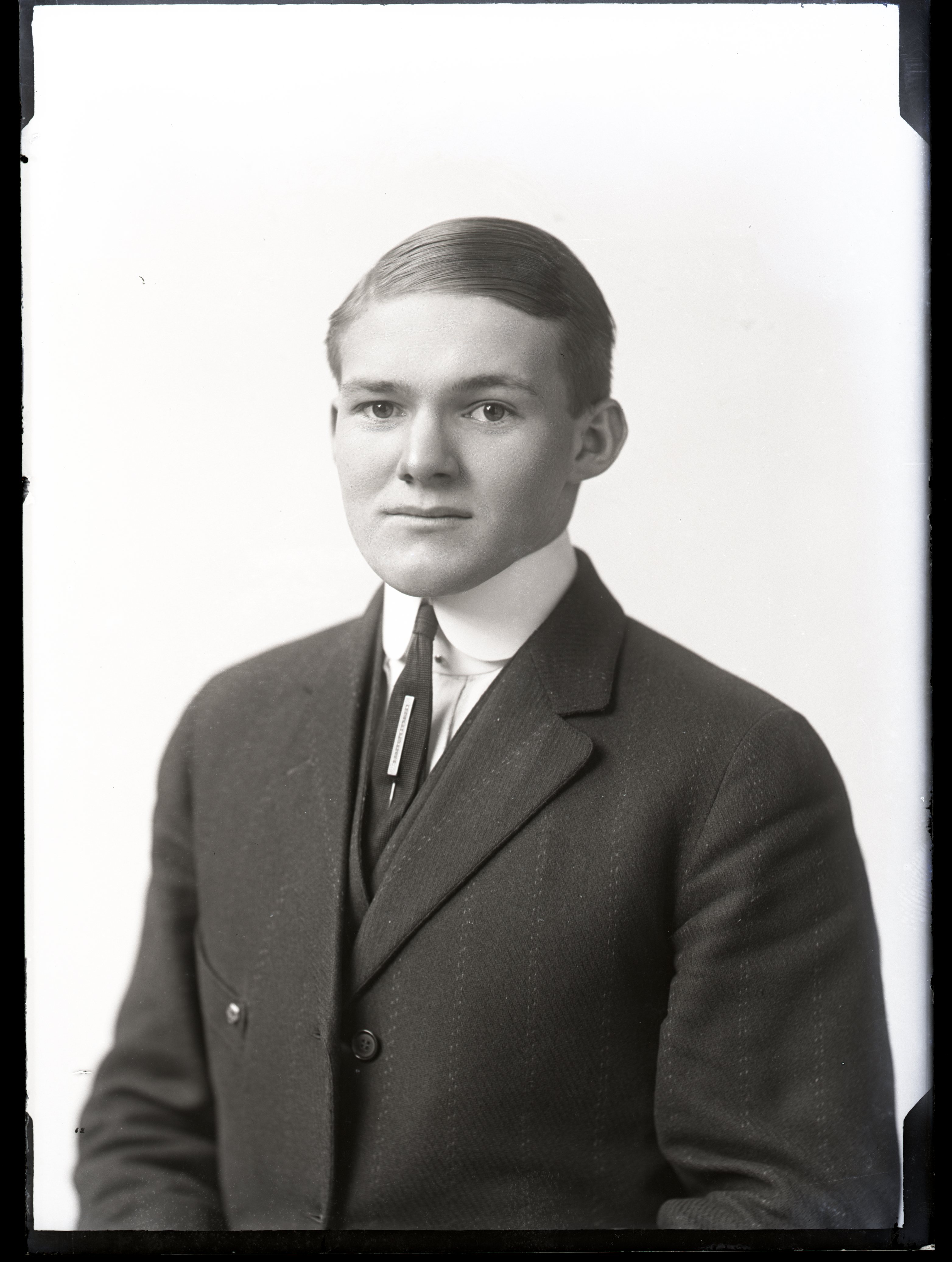 This is the glass negative of Urban McDonald, a student at Millikin University, and member of the Tau Kappa Epsilon fraternity. The photo was taken by Charles Wasson of Wasson Studios in Decatur, IL in the early 1900s.