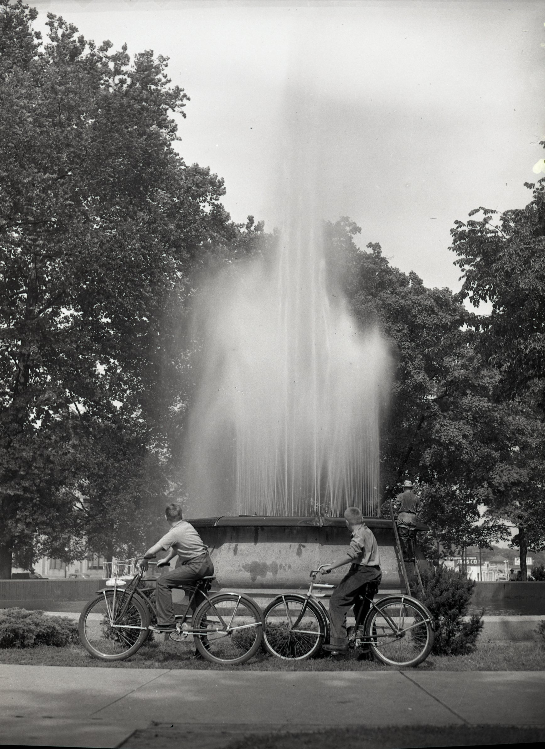 Central Park, fountain, boys, bicycles, negative, Decatur Herald & Review, Decatur IL