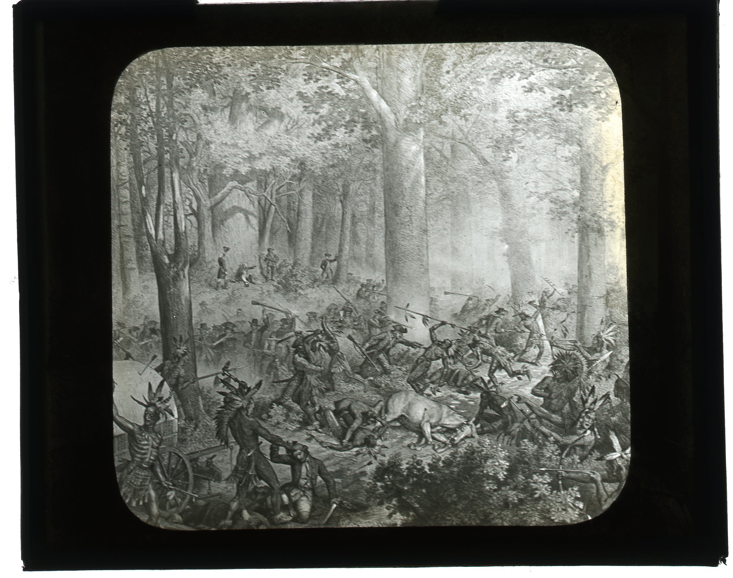 This is a glass negative copy of a print of the Battle of Orscany, NY on August 6, 1777. The photo was taken by Charles Wasson of International Stereograph Co. around 1900.