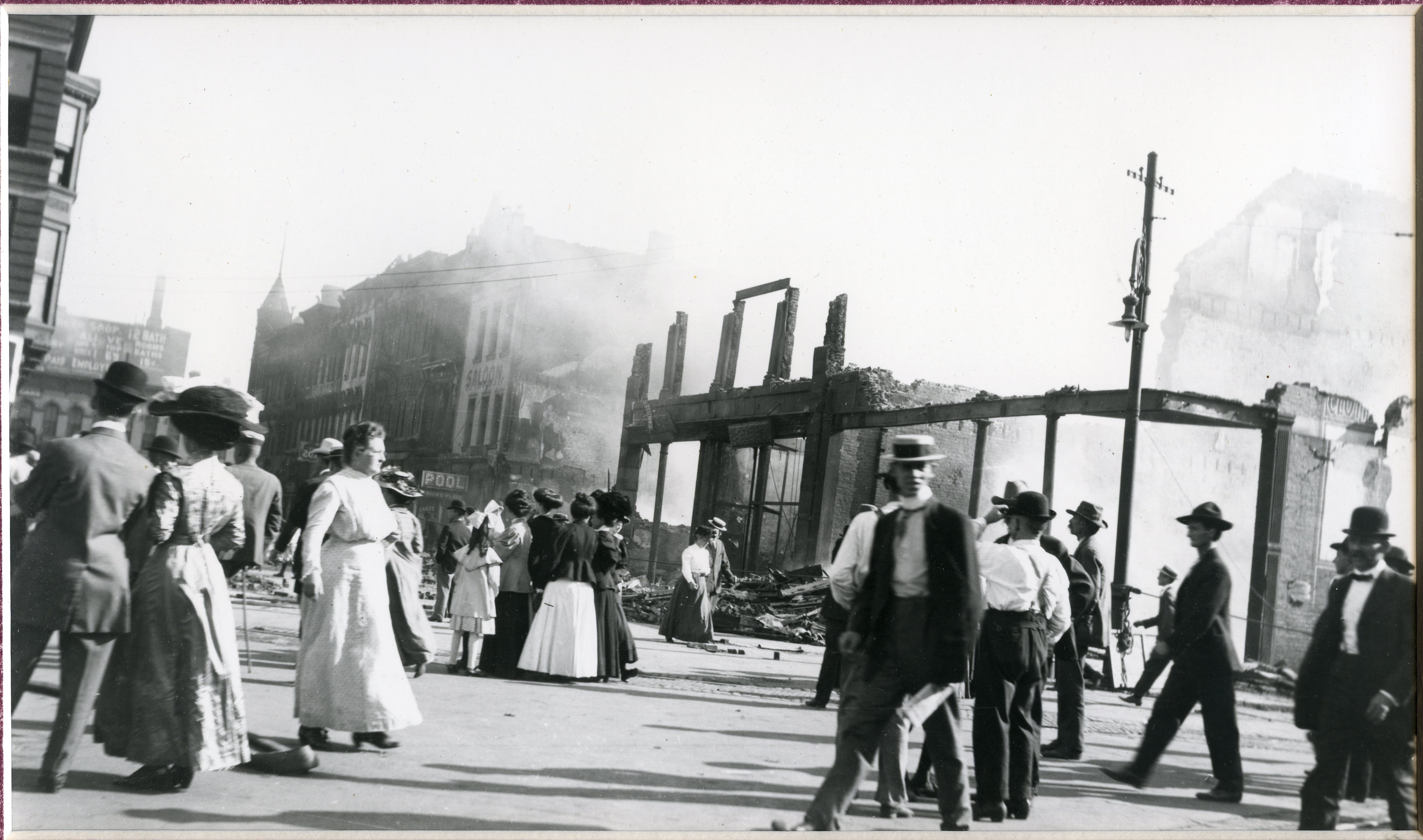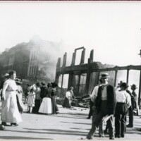 Photographs of people and horse and buggies at fire that burned down Cheap Charley's. Photograph of Cheap Charley's E. Main St. looking from the Transfer House, Decatur, IL.