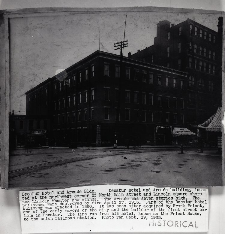 Photograph of the Decatur Hotel and Arcade Building, 1915. "The Decatur Hotel, building in center of photo, and Arcade Bldg., at the right of the Hotel, as pictured before they were destroyed by fire on April 21, 1915. They were located on the north west corner of Lincoln Square. Photo ran Review April 21, 1915."
