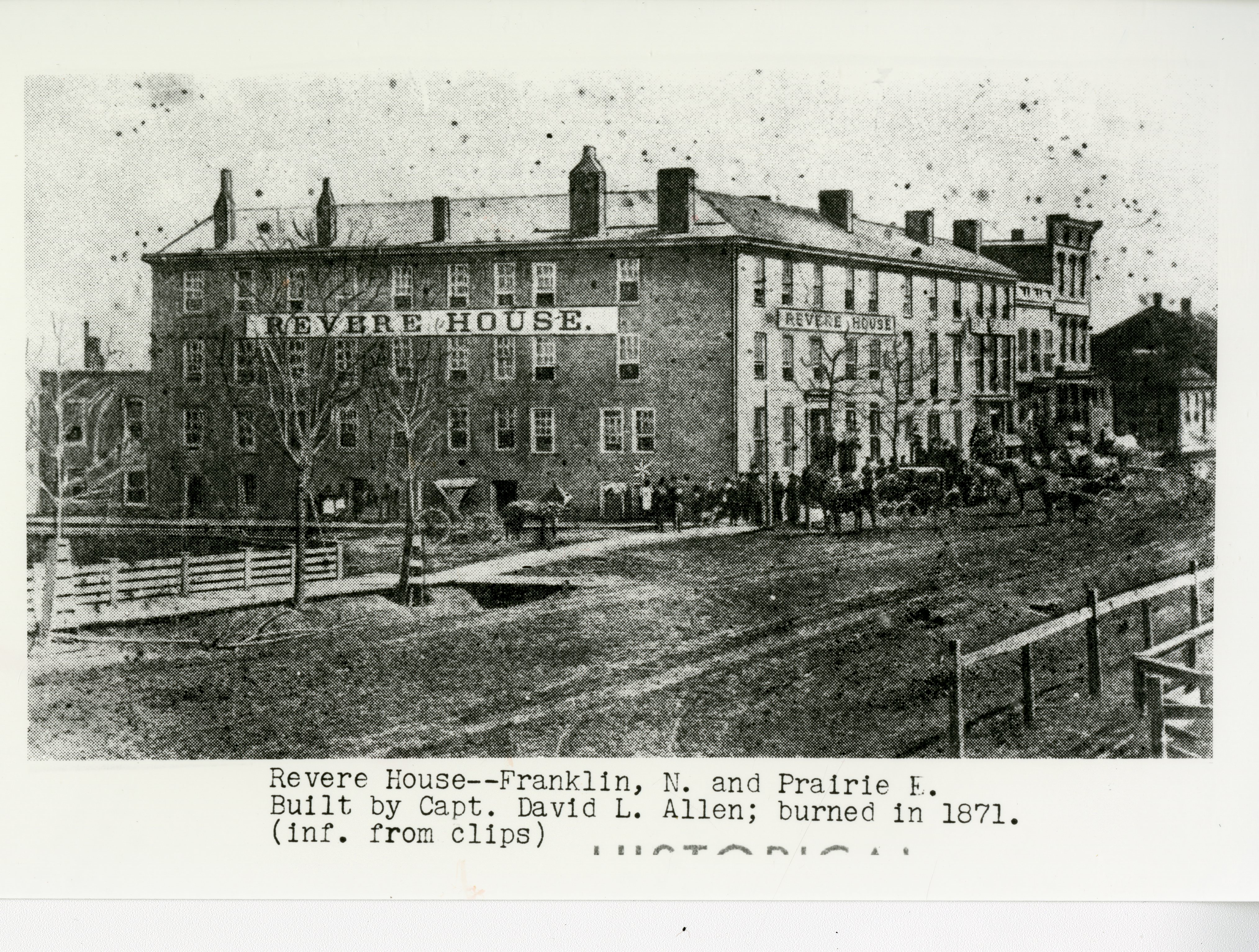 Photograph of the Revere House Hotel, N. Franklin and E. Prairie, built by Capt. David L. Allen; burned in 1871. The hotel was originally built in 1836 and had a succession of owners.