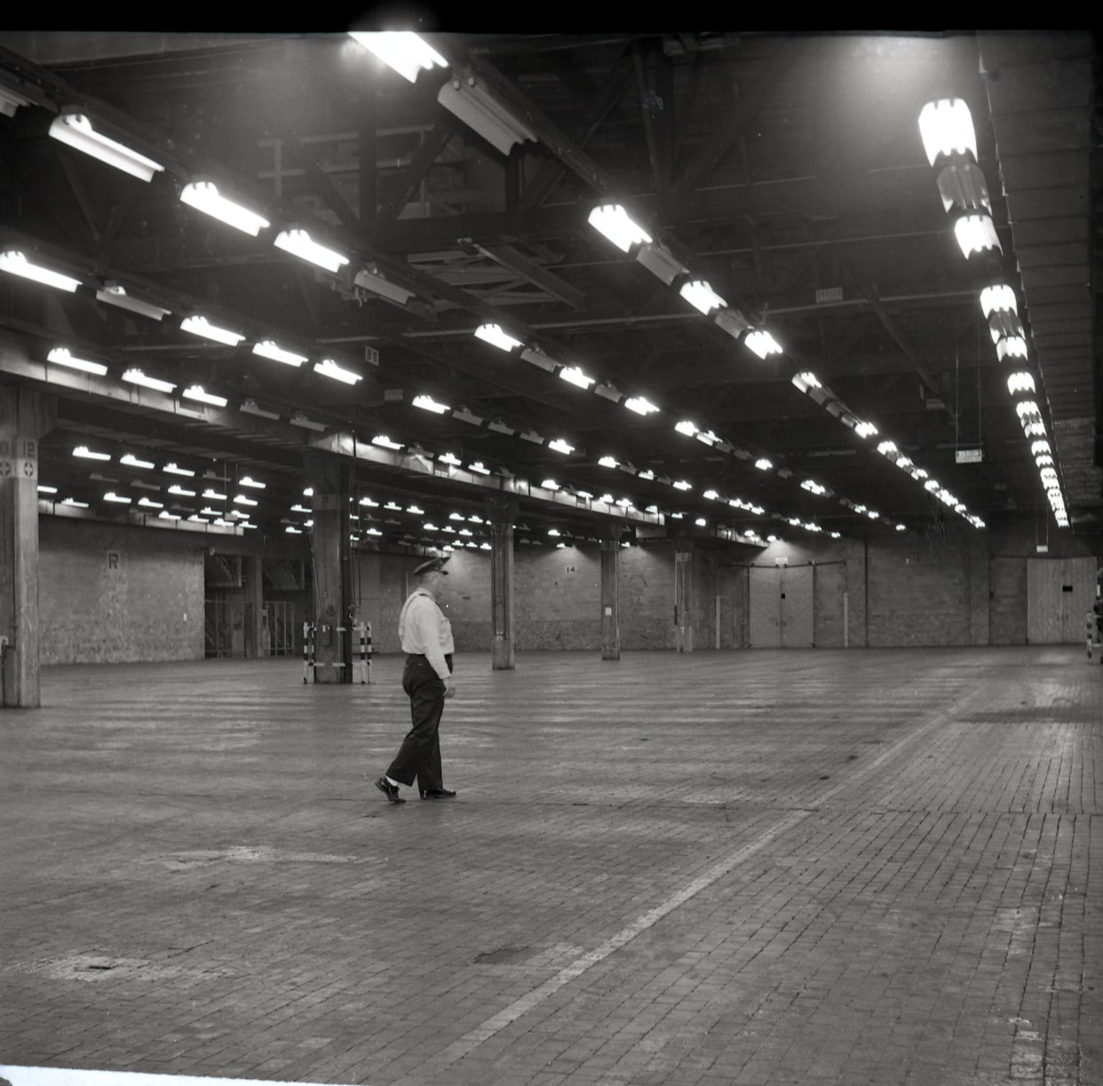 Photographs of U. S. Army Signal Depot. Group photograph of Army Group. Photograph of employees loading a truck with furniture. Photo of employees sitting at desks in an empty warehouse. Photograph of man operating a machine. Photographs of guard checking warehouse. Photograph of an empty warehouse. Photographs of employees working.