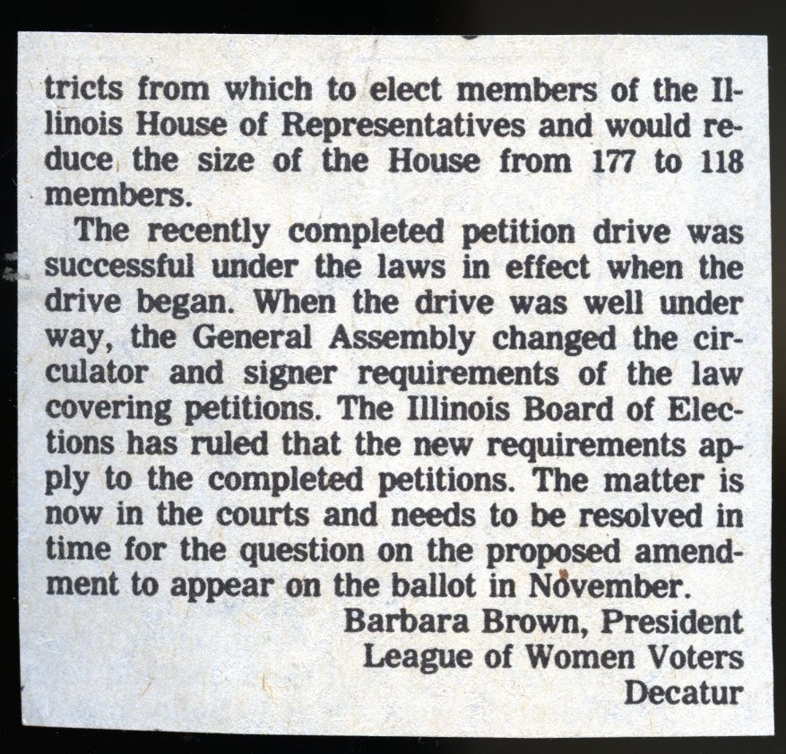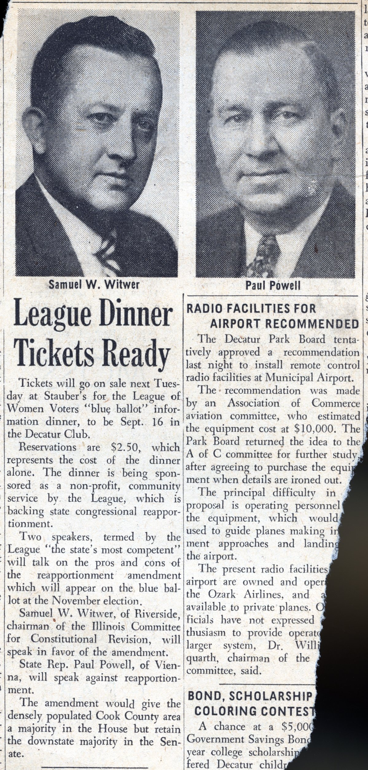 , “League of Women Voters - News Articles - Petition Drive - League Dinner Tickets- 1954,” Decatur Public Library Local History Photo Collection, accessed October 10, 2025, http://64.107.106.133/items/show/9130.
