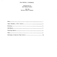 This is the transcription of Martha A. Montgomery's oral history. She was interviewed by Betty Turnell in November 1976. The interview includes her early life, family history, time in the Navy, teaching career, and time spent with the Macon County Historical Society, Decatur Genealogical Society, and Illinois State Genealogical Society.