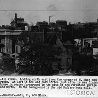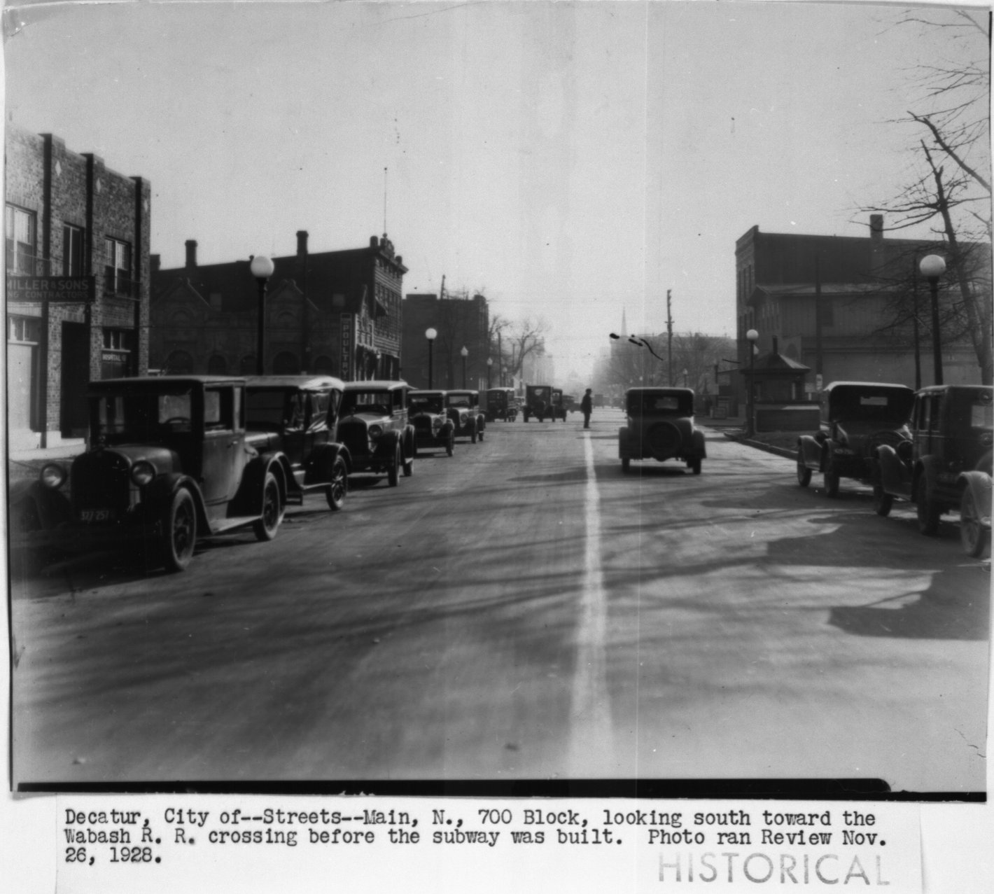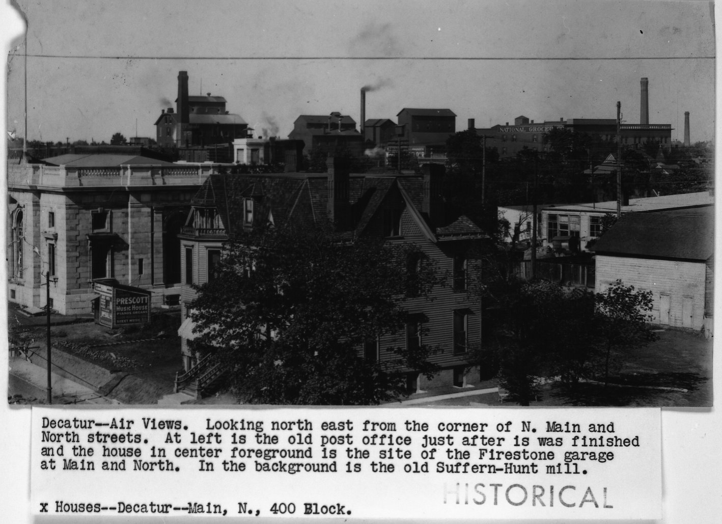Photograph "Decatur -- Air Views. Looking north east from the corner of N. Main and North streets. At left is the old post office just after it was finished and the house in center foreground is the site of the Firestone garage at Main and North Streets. In the background is the old Suffern-Hunt Mill." Photograph of buildings N. Main and E. William St. Library Block. Photographs of N. Main street buildings with street car. Photograph of paving machine on N. Main St. photo by Rembrandt. Photograph 200 Block N. Main St. looking south from William St. Seitz Studio c. 1928. Photograph of street cars, people, cars and horse drawn wagons. Photograph 700 Block N. Main St. looking south toward the Wabash R. R. crossing before the subway was built. Photo ran in the Review Nov. 26, 1928.