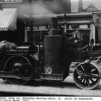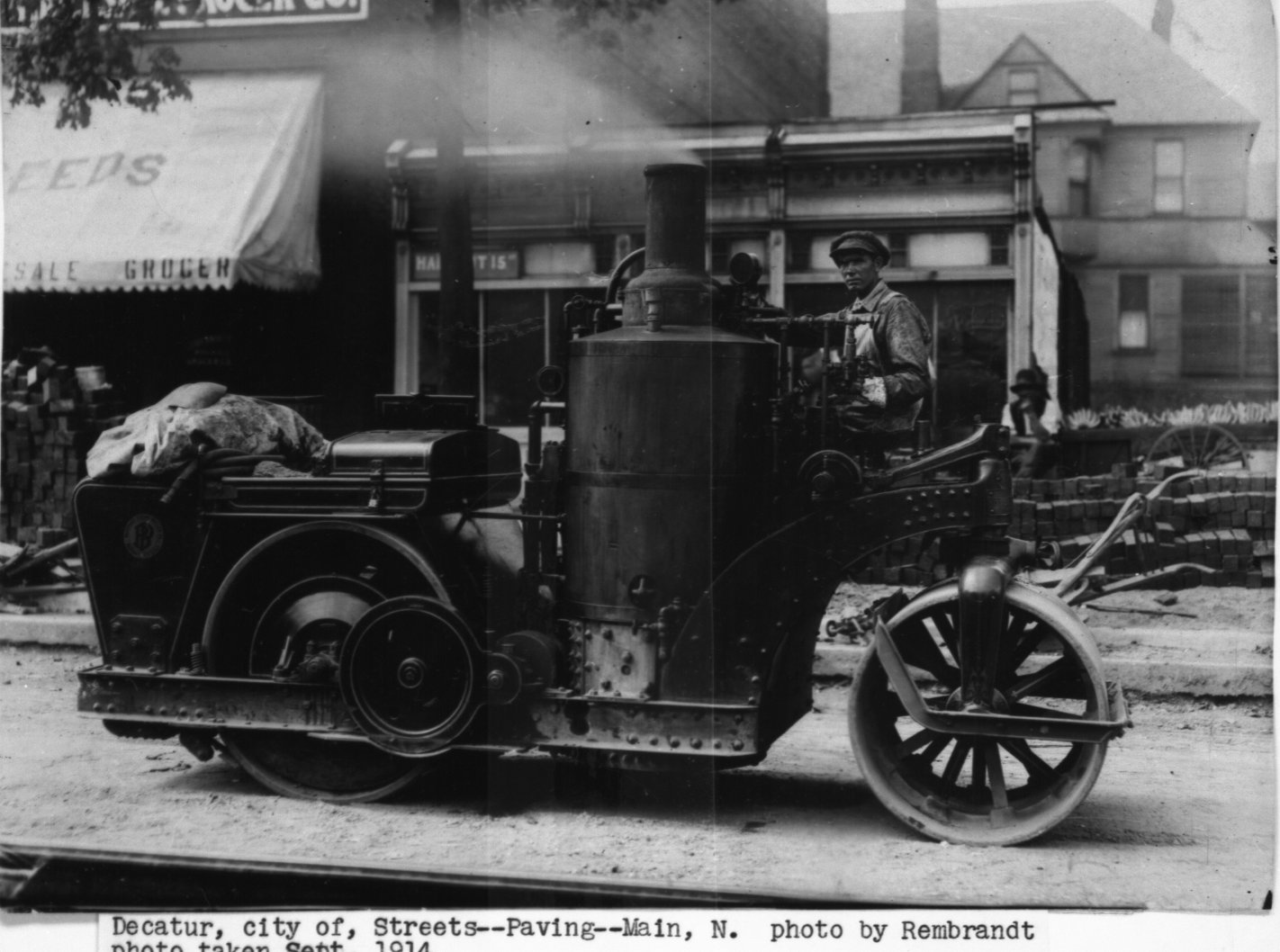 Streets, N. Main St., North St., Post Office, Firestone Garage, Suffern-Hunt Mill, Library Block, Buildings, Paving Machine, Street Cars, People, Automobiles, Decatur, IL.