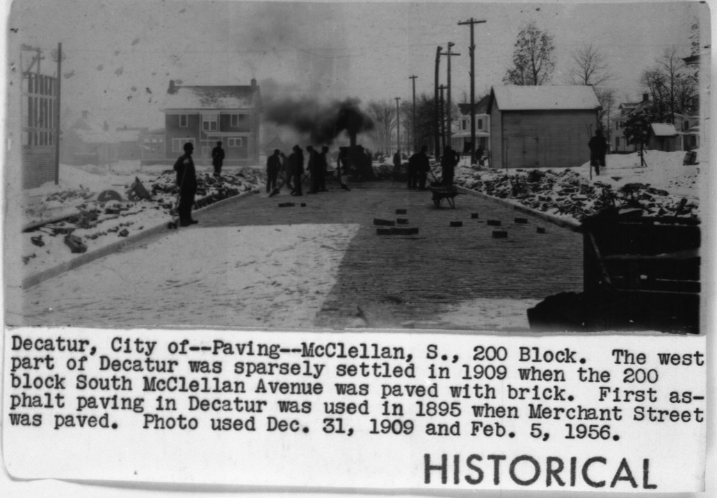 Herald and Review, Decatur, IL., “Photo of 200 Block S. McClellan getting paved,” Decatur Public Library Local History Photo Collection, accessed November 18, 2025, http://64.107.106.133/items/show/9338.