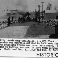 Photograph "Decatur, City of --Paving--McClellan, S. 200 Block. The west part of Decatur was sparsely settled in 1909 when the 200 block south McClellan Avenue was paved with brick. First asphalt paving in Decatur was used in 1895 when Merchant Street was paved. Photo used Dec 31, 1909 and Feb. 5, 1956."