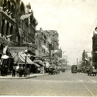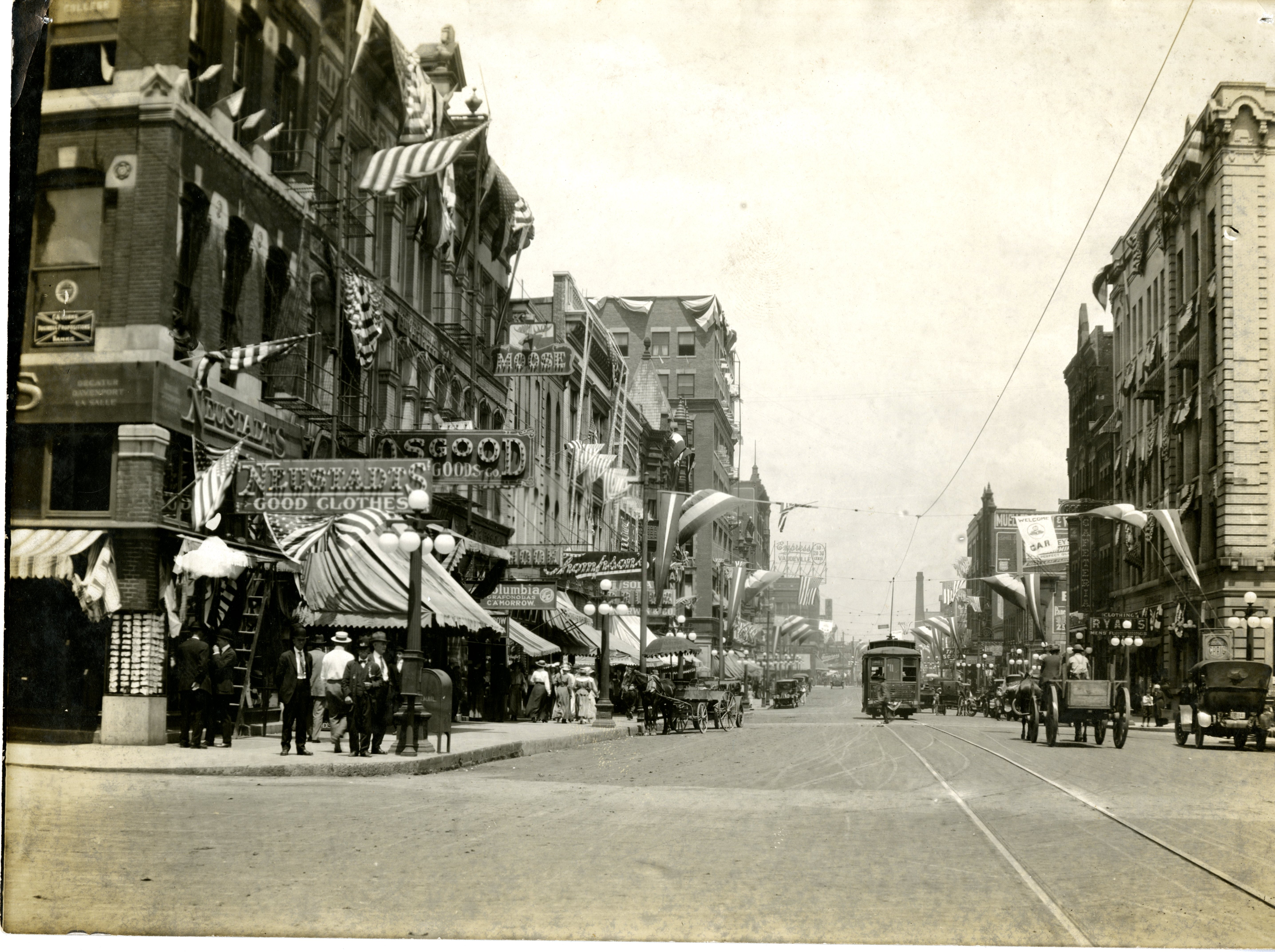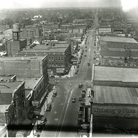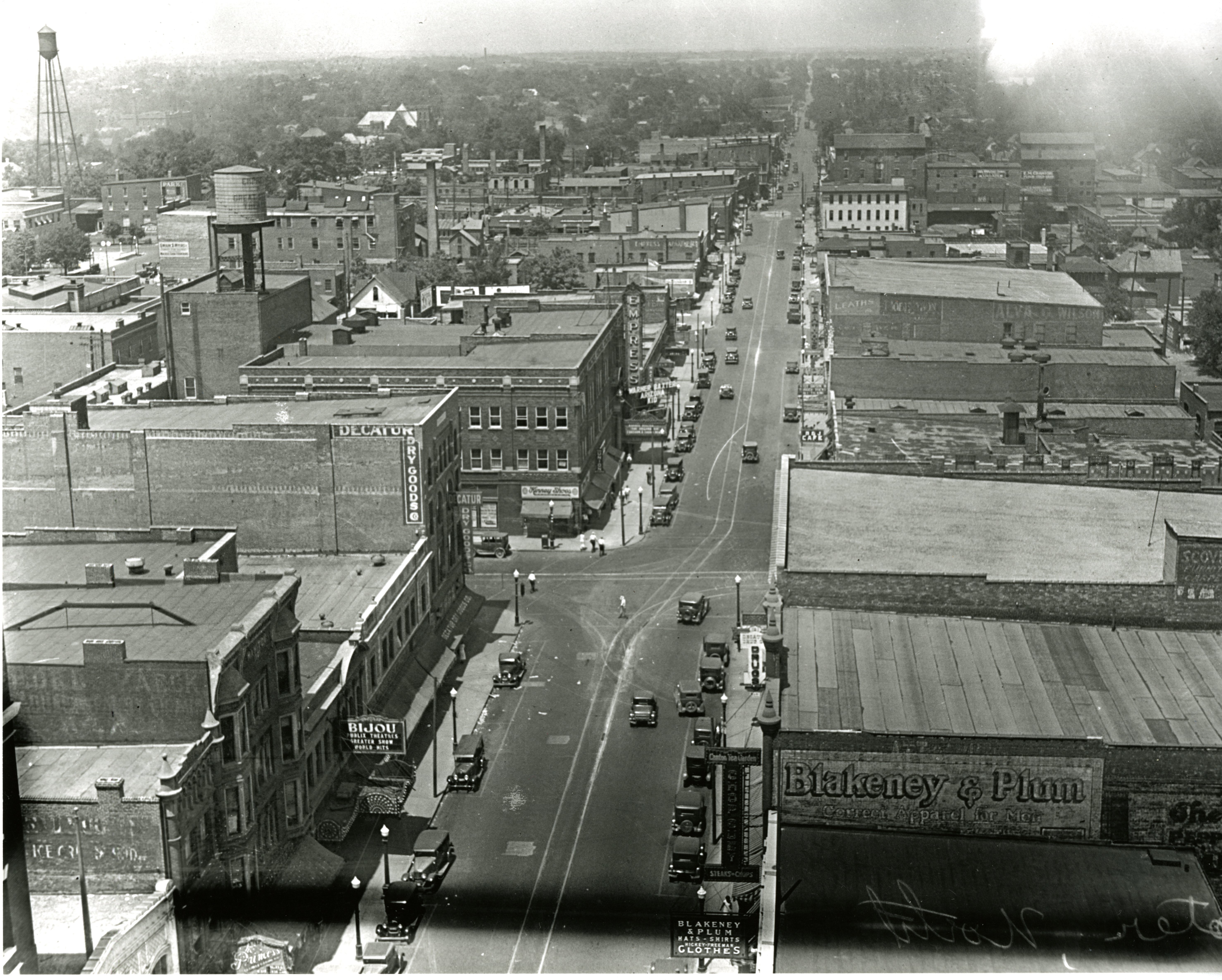 Photograph of businesses on the 200 block of N. Water Street, Decatur, IL. about 1910. Aerial photograph of the 300 block of N. Water Street, July 1930.