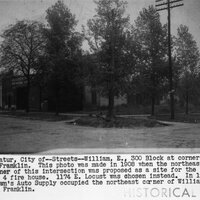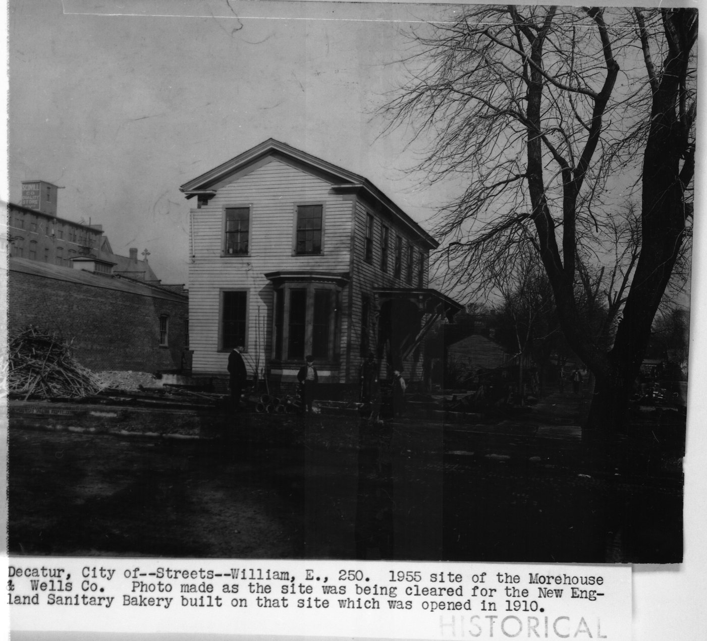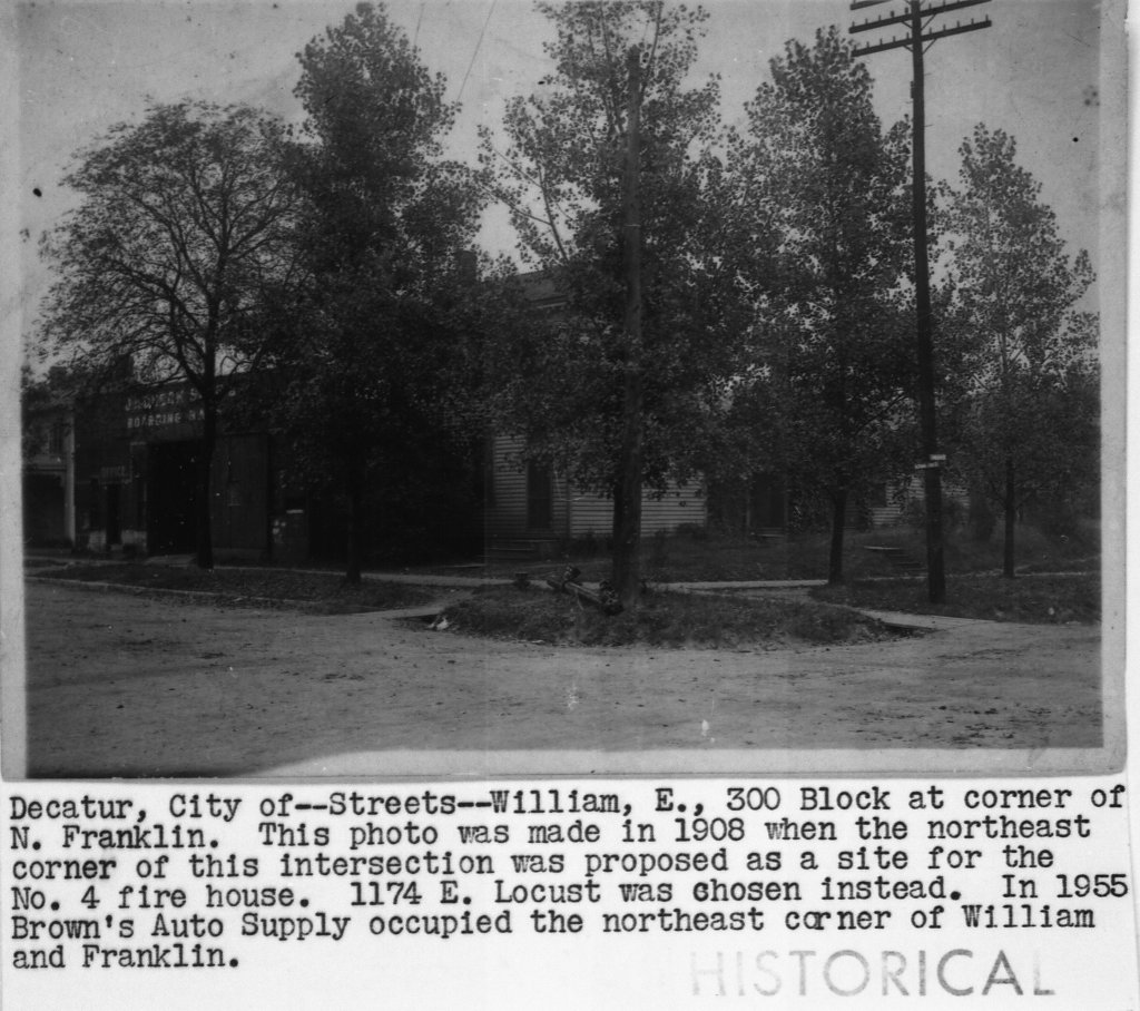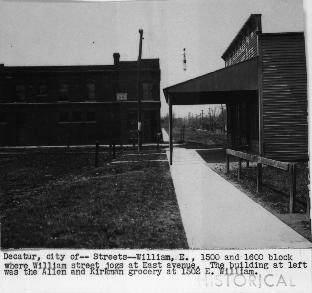 Photograph: "Decatur, City of--William, E., 250. 1955 site of the Morehouse & Wells Co. Photo made as the site was being cleared for the New England Sanitary Bakery built on that site which was opened in 1910." Photograph: "Decatur, City of--Streets--William, E. 300 Block at corner of N. Franklin. This photo was made in 1908 when the northeast corner of this intersection was proposed as a site for the No. 4 fire house. 1174 E. Locust was chosen instead. In 1955 Brown's Auto Supply occupied the northeast corner of William and Franklin." Photograph : "Decatur, city of--Streets--William, E., 1500 and 1600 block where William street jogs at East Avenue. The building at left was Allen and Kirkman grocery at 1502 E. William."