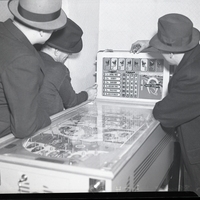 Photograph of three men looking at pinball machine used in gambling, Merchant Street, Decatur, IL.