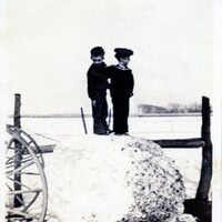 Photograph of two girls sitting on a wagon in Fowler, CO in 1921.
